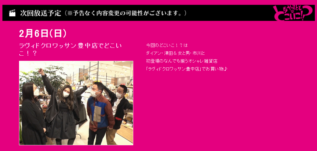 2022年2月6日(日)放映のテレビ大阪「やすとものどこいこ!?」で、海原やすよ・ともこのお二人、ゲストのダイアン・津田さん、女と男・市川さんが豊中店にご来店くださいました。 やすよさん、ともこさん、津田さん、市川さん、この度はご来店いただきありがとうございました! またのご来店、心よりお待ちしております。 ご覧いただいたものを一部抜粋して掲載いたします。