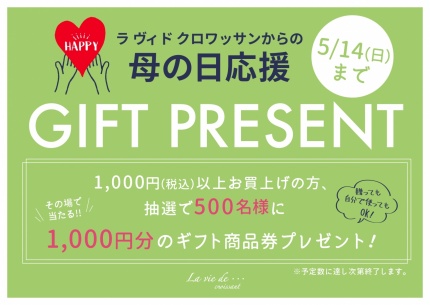 さらにさらに!母の日までの期間中、お店からの「母の日応援企画」といたしまして、税込¥1000以上お買い上げの方に抽選でその場で当たる1000円分の商品券を合計500名様にプレゼント!