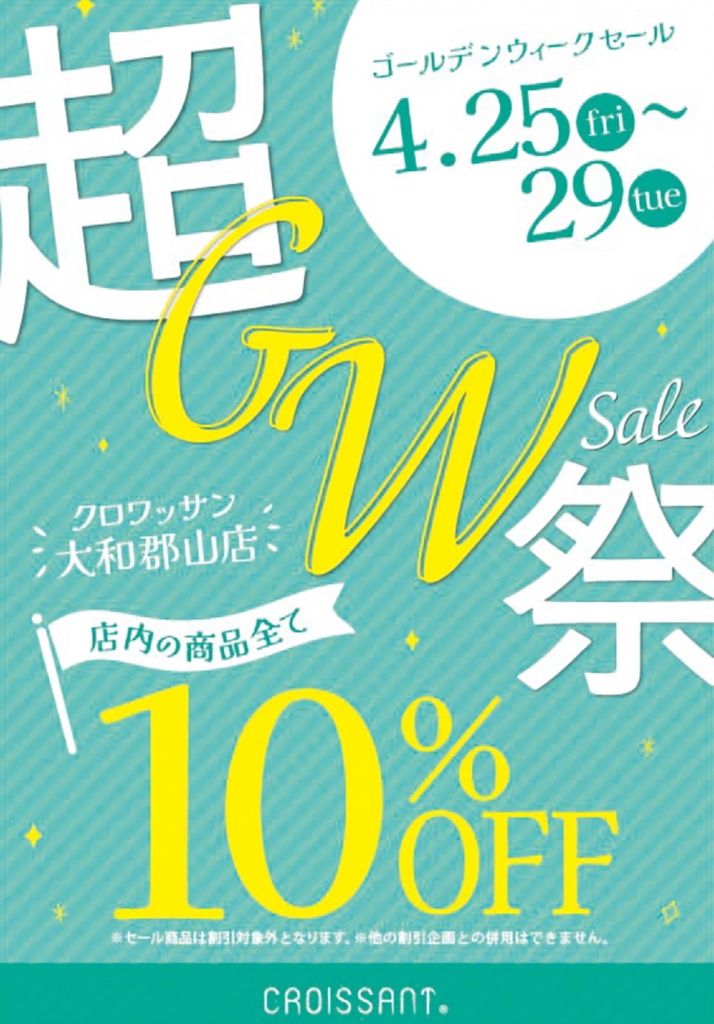 クロワッサン大和郡山店のオトクなSALEのお知らせです♪ 2025/4/25(金)~4/29(火・祝)の5日間、店内商品が10%OFF!! 是非ゴールデンウイークのお買いものをオトクに楽しみに来てくださいね♪ ※本セールは、クロワッサン大和郡山店のみでの開催となります。 ※SALE品など、一部対象外商品がございます。 ※他の割引との併用はできません。