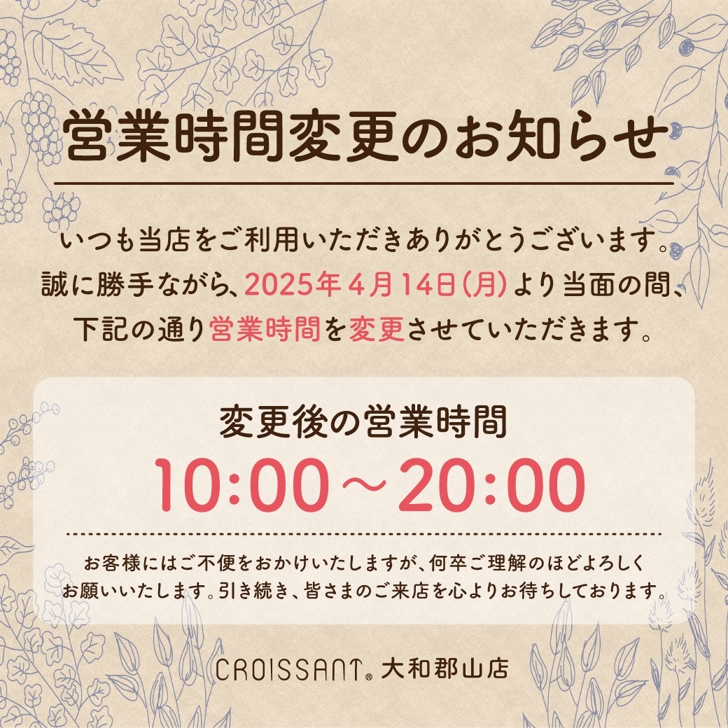 営業時間変更のお知らせ いつも当店をご利用いただき、ありがとうございます。 誠に勝手ながらクロワッサン大和郡山店は2025年4月14(月)より当面の間、営業時間を10時~20時に変更させて頂きます。 お客様にはご不便をおかけしますが、何卒ご理解のほどよろしくお願いいたします。