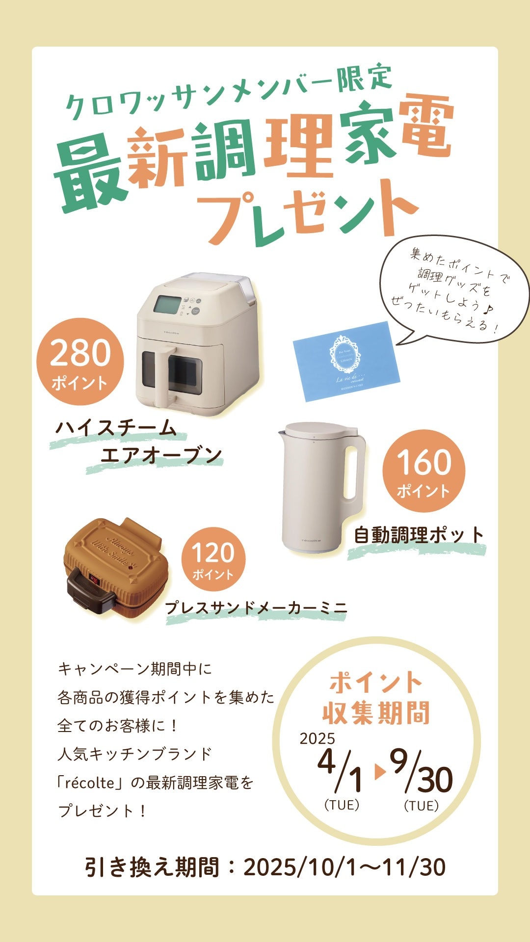 クロワッサンメンバー会員様限定でポイントを貯めると必ず最新調理家電が貰える