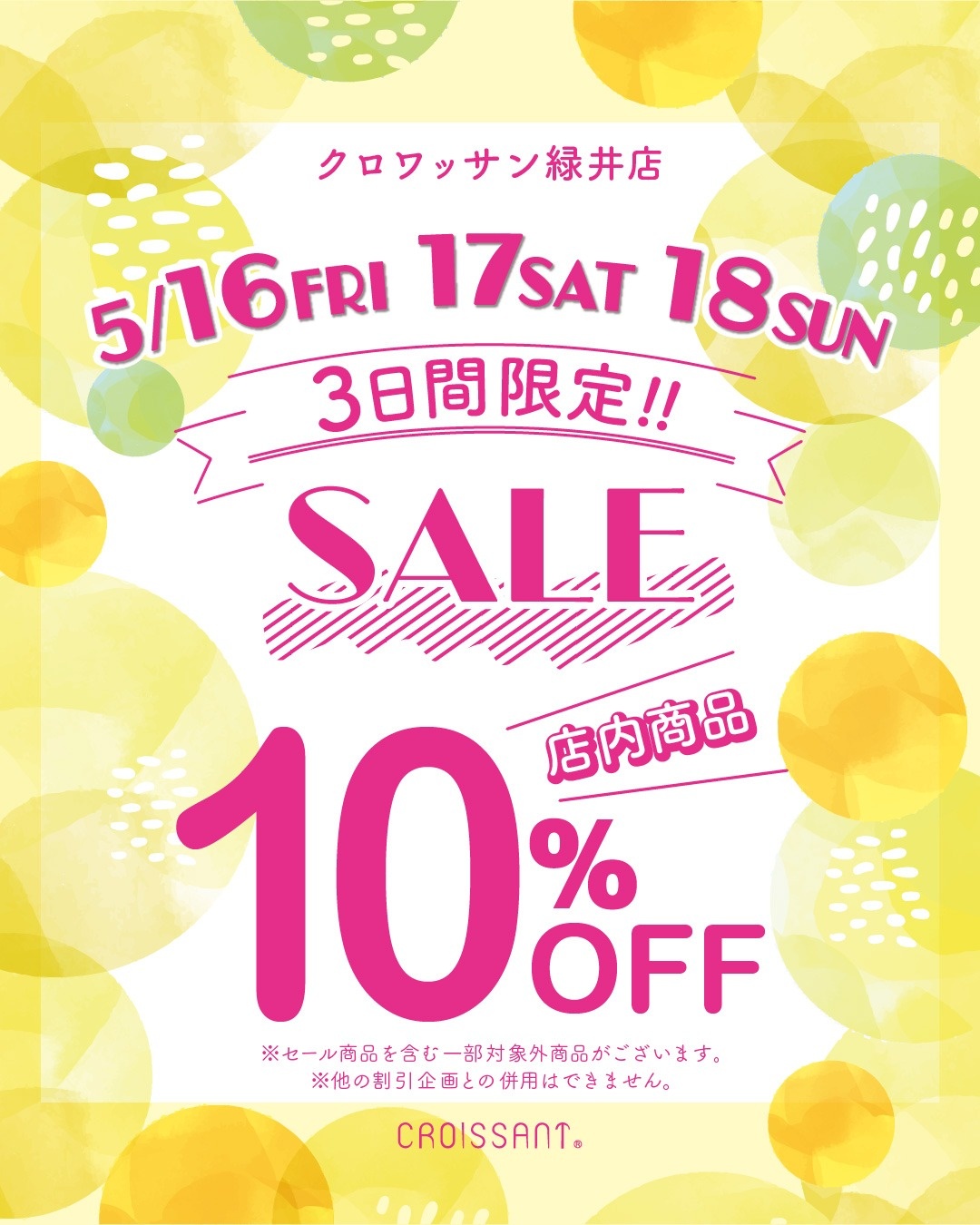 クロワッサン緑井店では、5/16(金)~5/18(日)の3日間限定で、 店内商品10%OFFを開催中!! 皆さまのご来店、スタッフ一同心よりお待ちしております。 ※SALE品を含む一部対象外商品がございます。 ※他の割引との併用はできません。
