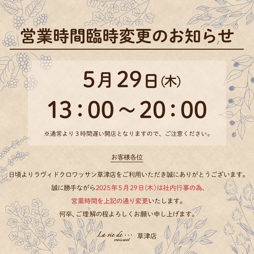 この度、5/29(木)の営業時間を下記の通り変更させていただくこととなりました。