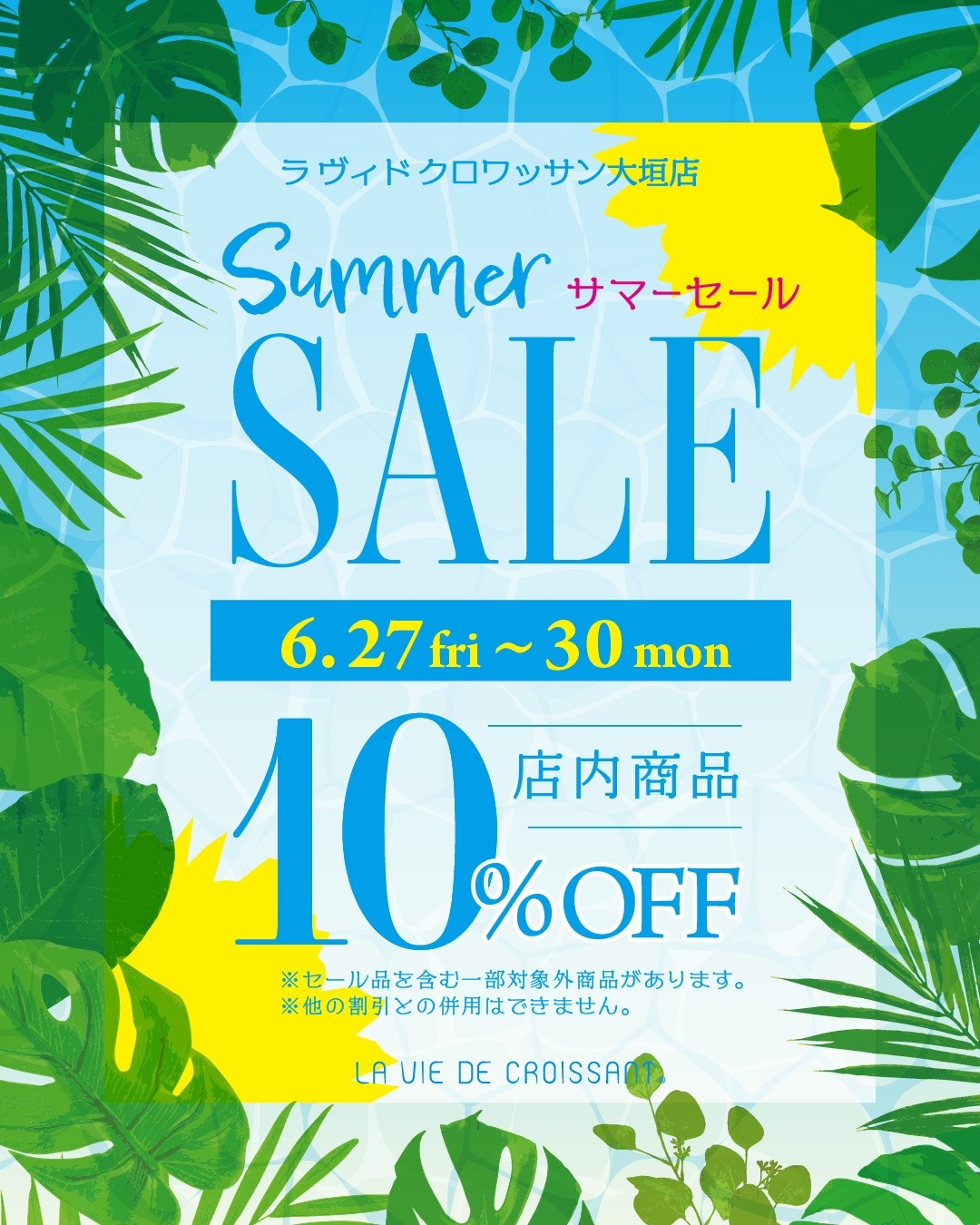 ラヴィドクロワッサン江南西店では、 6/27(金)~6/30(月)の4日間、サマーセールを開催いたします。 上記期間中、店内商品全品10%OFF!! 夏物アイテムやクール雑貨なども対象となりますので、 是非この機会に皆さまのご来店、スタッフ一同心よりお待ちしております。 ※SALE品を含む一部対象外商品がございます。 ※他の割引との併用はできません。