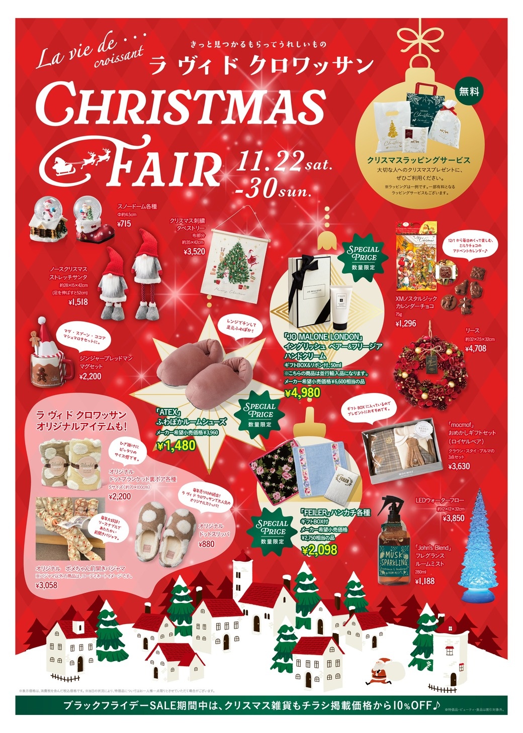 期間中、ラヴィドクロワッサン豊田店・浜松店・草津店・豊中店では、クリスマス商品含む店内商品が10%OFF!
