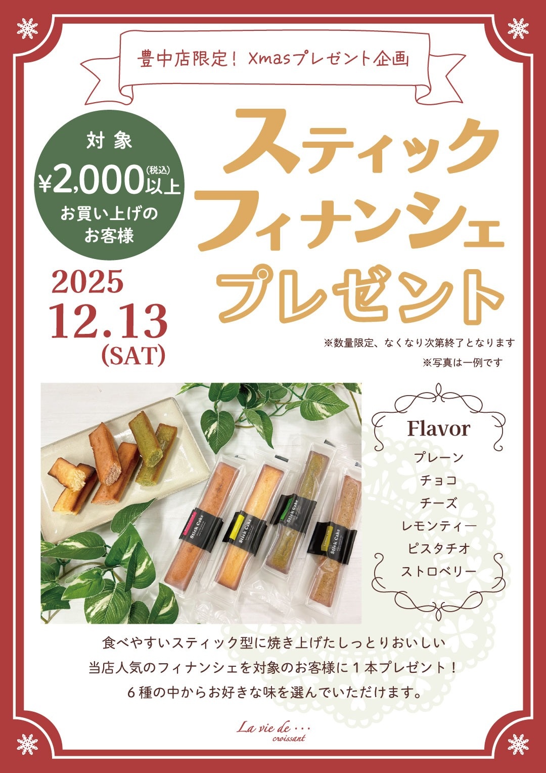\豊中店限定!Xmasプレゼント♪/ ラヴィドクロワッサン豊中店にて 税込¥2000以上お買い上げのお客様に スティックフィナンシェプレゼント♪ 是非この機会に遊びに来てくださいね! ■ 日程 2025年12月13日(土) ※予定数がなくなり次第、終了となります。 ※1会計につき、おひとつ限りのお渡しとなります。 ■開催店舗:ラヴィドクロワッサン豊中店