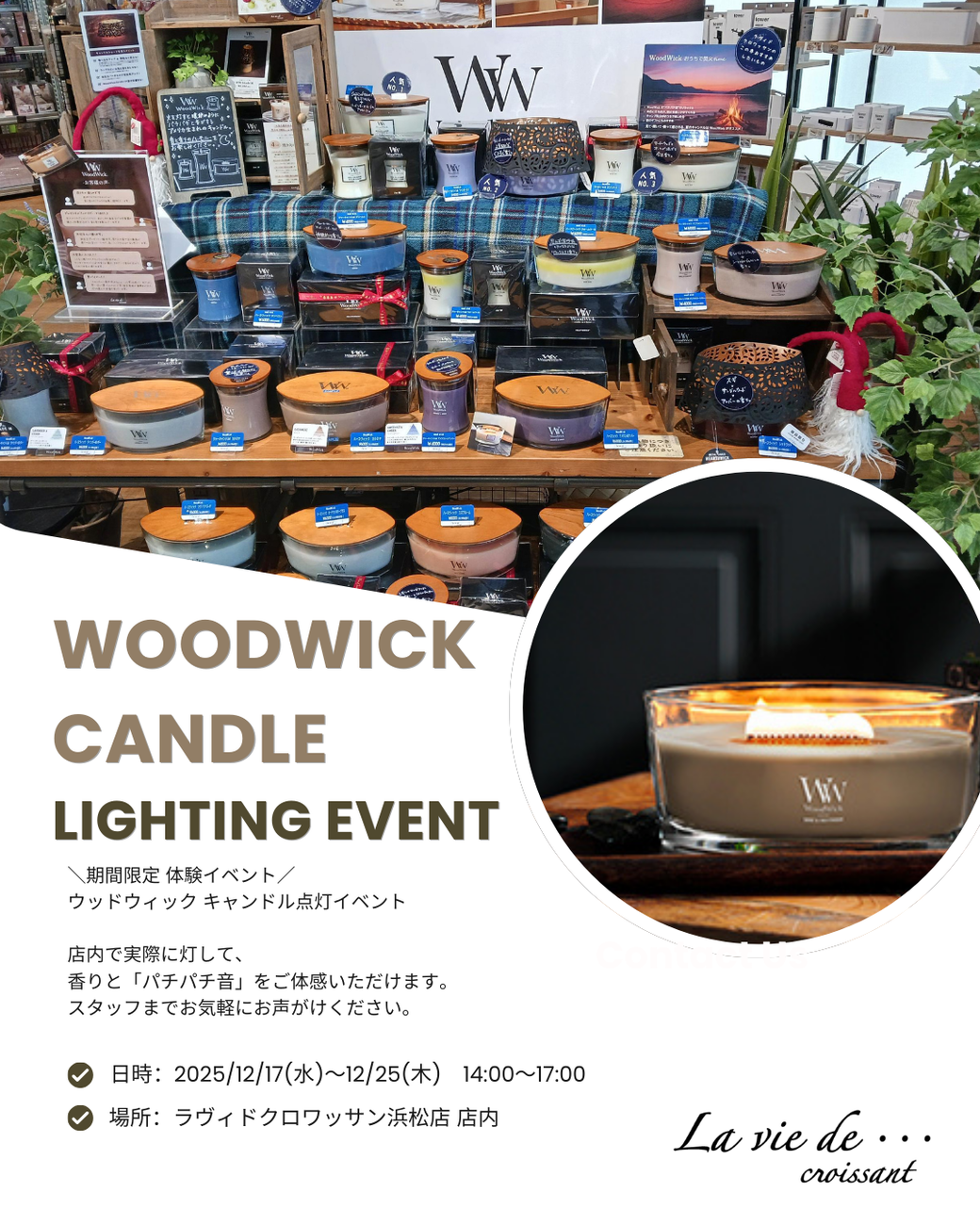 ラヴィドクロワッサン浜松店にて、 ウッドウィックキャンドルの店頭イベントを行います。 ■ 日程 2025/12/17(水)~12/25(木) 14:00~17:00 香りと癒しの「パチパチ音」をご体感頂けます。 お試し希望の方は、スタッフまで気軽にお声がけください。 是非皆さまお誘いあわせの上、ご来店お待ちしております。 ■開催店舗:ラヴィドクロワッサン浜松店