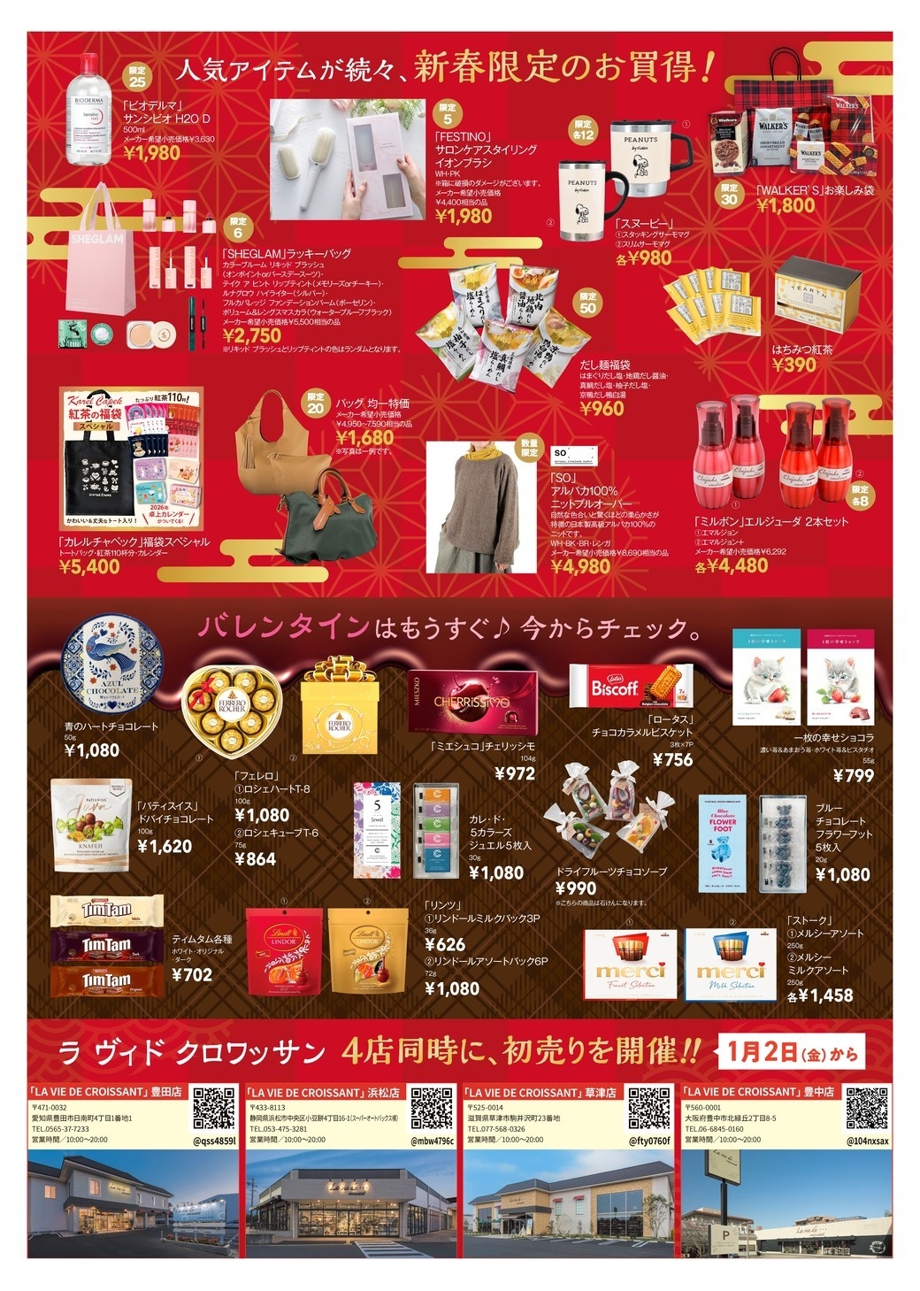 ラヴィドクロワッサン豊田店・浜松店・草津店・豊中店から、新春SALEとお得な福袋や特価品が掲載されております新聞折込チラシのご紹介です!