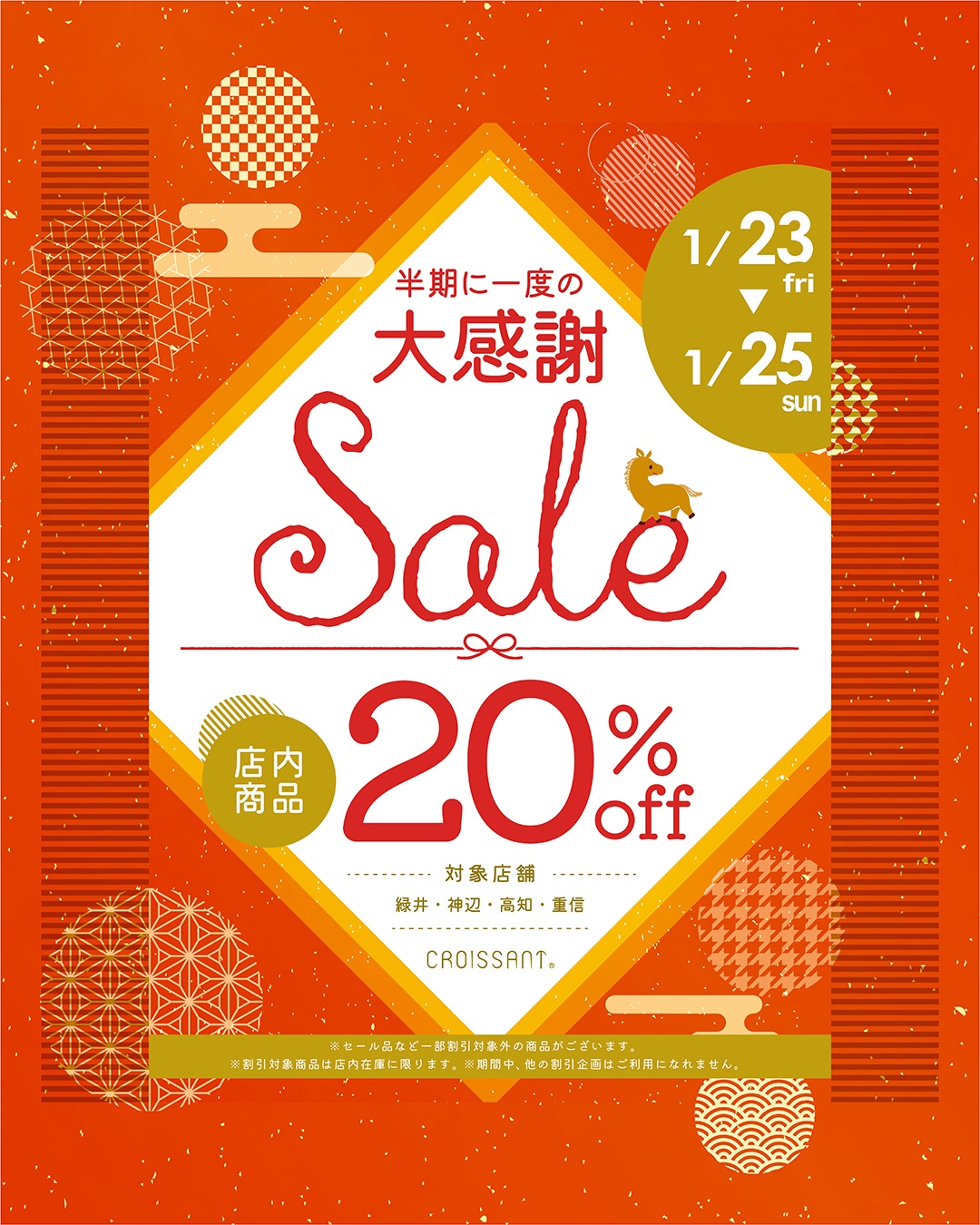 クロワッサン緑井店・神辺店・重信店・高知店では、2026/1/23(金)~1/25(日)の3日間、店内商品が20%OFFの半期に一度の大感謝SALEを開催させていただきます!