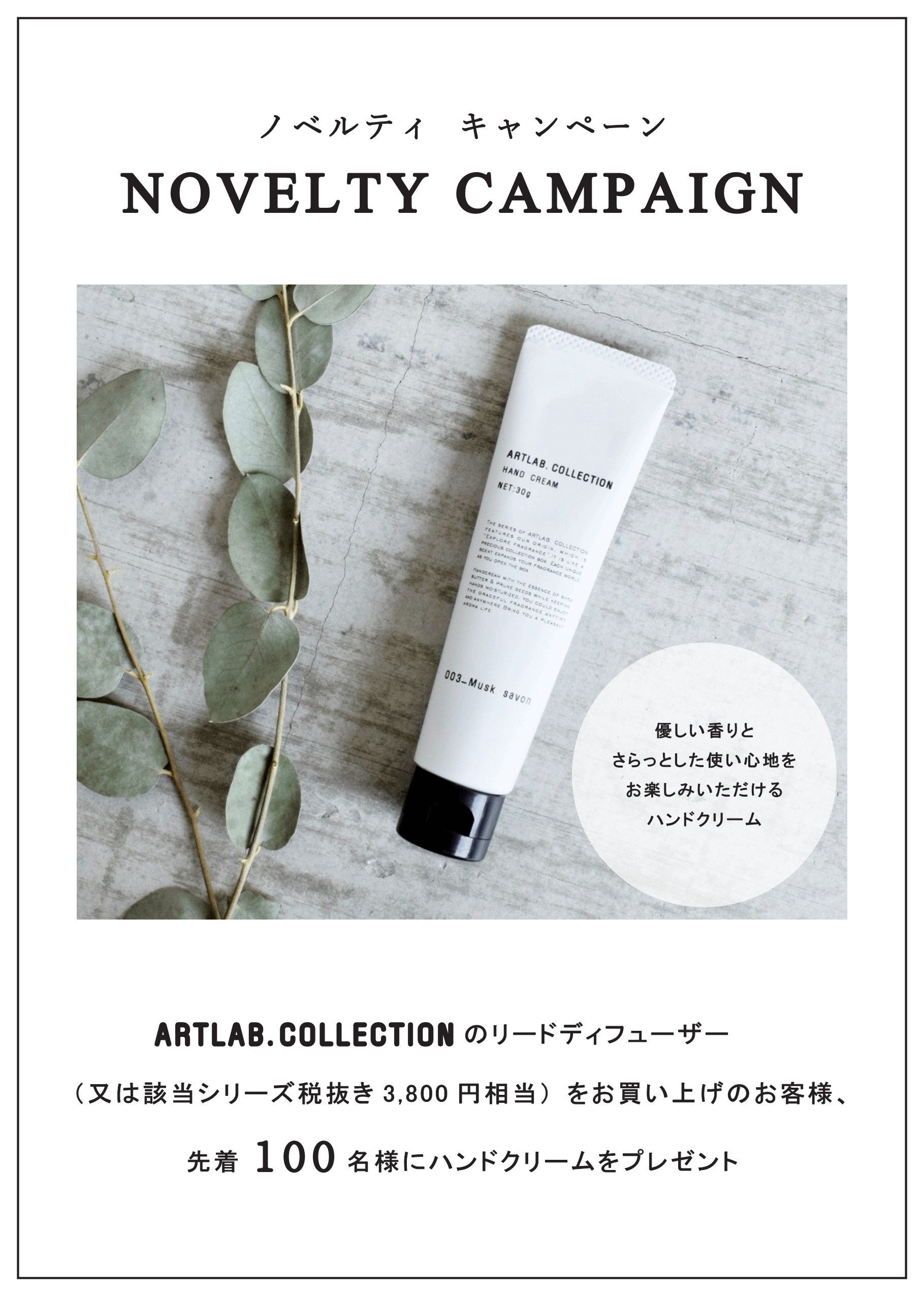 【ラヴィドクロワッサン草津店限定】 ARTLABノベルティキャンペーンの開催のお知らせです♪ ARTLAB.COLLECTIONのリードディフューザーをお買い上げのお客様に、 先着100名様限定でハンドクリームをプレゼント! 優しい香りとさらっとした使い心地をお楽しみいただけるハンドクリーム、 是非この機会にお得にGETしてみてくださいね。 ※本キャンペーンは草津店限定となります。 ※予定数に達し次第、終了となります。