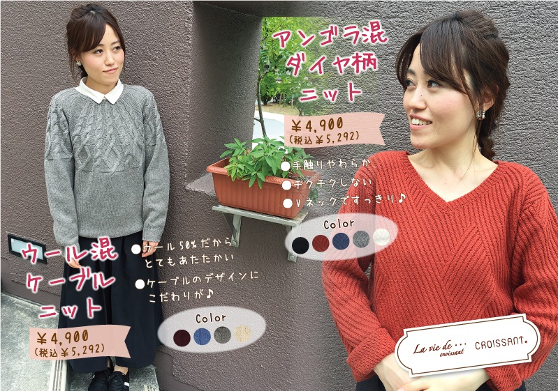 クロワッサンオリジナルのアンゴラ混ダイヤ柄ニットとウール混ケーブル編ニットが入荷!